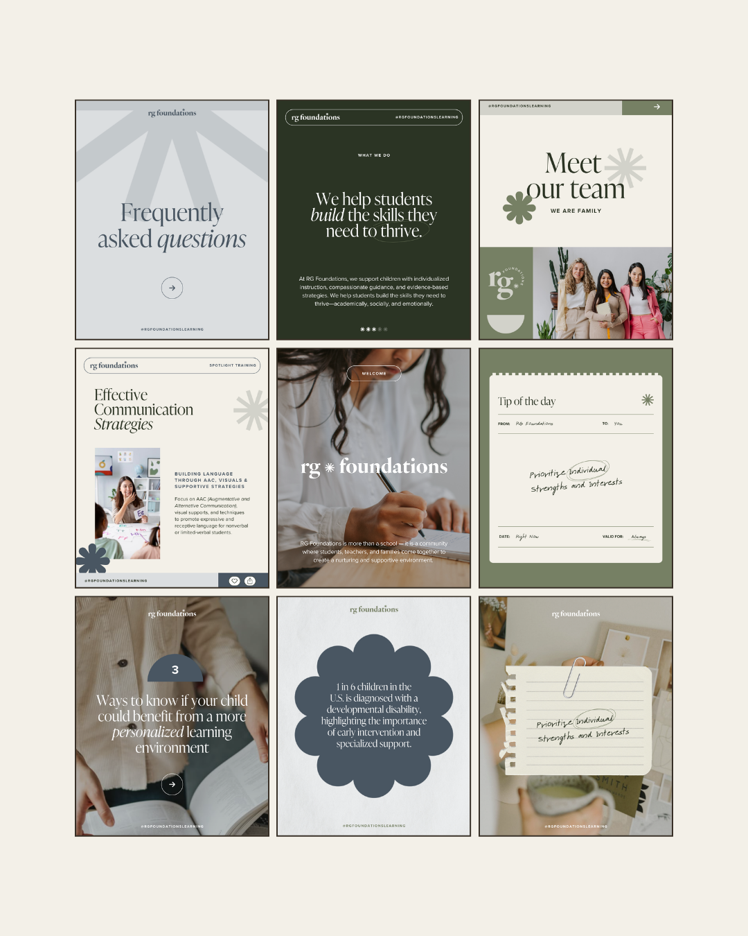 RG Foundations is a comprehensive educational center for early learners based in Miami, FL. I created a brand identity that’s grounded, minimal, and deeply welcoming—reflecting both the school’s mission and our shared Miami roots. A sunburst icon built from an asterisk sits at the heart of the logo, symbolizing community, spark, and new beginnings. Paired with classic serif typography, the design feels strong yet approachable, evoking trust and warmth. Flexible logo variations and a cohesive visual system bring the brand to life in a way that’s expressive, educational, and rooted in purpose.